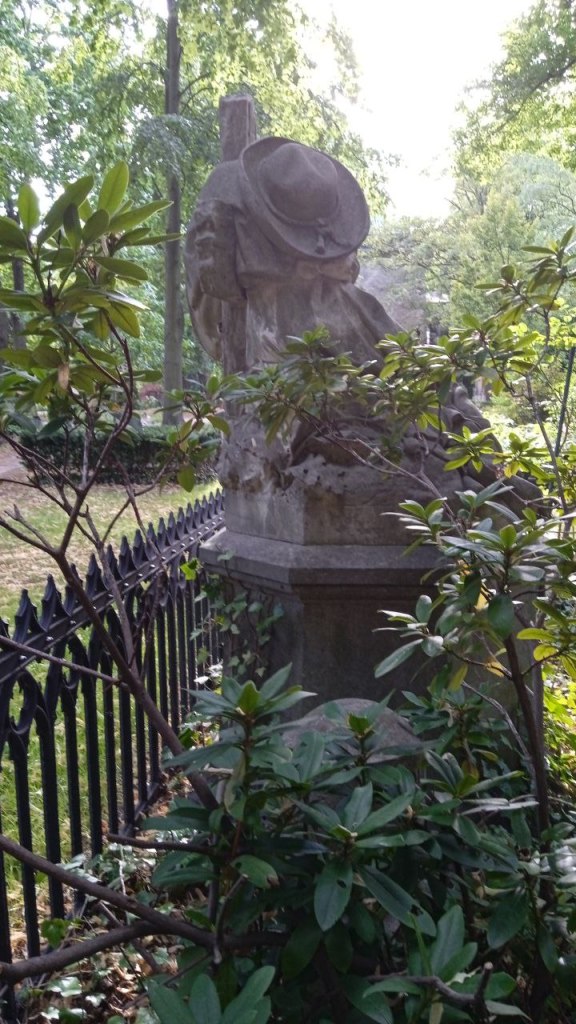 Ich drehe mich um und denke: Nein, es kann nicht sein, es gibt keinen Don Quijote als eine Grabfigur! Ich gehe näher, laufe um das Grab herum und sehe einen Pilger, so einen, den man immer wieder auf dem Jakobsweg (Camino de Santiago) trifft und der, ja, vom Weitem tatsäschlich wie Don Quijote aussieht.