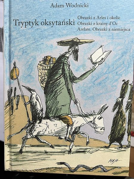 Tych pseudo Don Kichotów jest u Maja więcej, w samym wydawnictwie Austeria – dwóch. Zdobią okładki książek profesora Adama Wodnickiego. Ale, choć myślałam, że tak właśnie jest – nie przedstawiają samego profesora. Profesor, Adam Wodnicki, tłumacz literatury francuskiej i profesor ASP (Wydział Form Przemysłowych) w Krakowie, był nie dość, że mężczyzną gładko wygolonym, to jeszcze konkretnie spoglądającym na obserwatora (proszę kliknąć w linka). Tymczasem ta postać na ośle jest roztargnionym profesorem z anegdot o profesorach, skrzyżowaniem wyimaginowanego pana Ambrożego Kleksa i jego owianego legendą warszawską pierwowzoru – Franca Fiszera (też proszę kliknąć w linka). Ale Daniel Maja portretuje też pana, który jednak być może jest profesorem-autorem (po prawej):