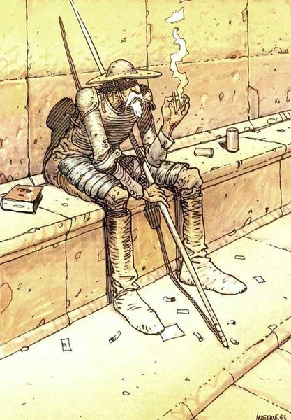 O ile ten po prawej (rysunek Moebiusa; zob. TU) to zaiste Don Kichot, taki któremu znudziło się donkichotowanie i donkiszoteria i który, po prawdzie tak samo jak Jezus i Syzyf (o których pisałam TU), postanowił wszystko olać, odpocząć i odciąć się od obowiązków, o tyle ten po lewej, dzieło podpisane MAJA (tak – ten Maja, inspirator mnie z góry uprzedził, że to mężczyzna), to jednak zapewne wcale nie Don Kichot, tylko jeżdżąca na ośle imitacja. Czyli fejk.