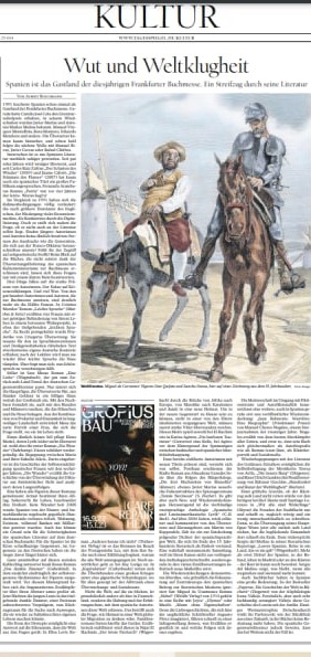 Najpierw, kilka tygodni temu, gdy Hiszpania była głównym gościem tegorocznych Targów Książki we Frankfurcie, Christine Ziegler przysłała mi artykuł z berlińskiej gazety codziennej Tagesspiegel. Traktował o współczesnej literaturze Hiszpanii, a zilustrowany był miedziorytem, przedstawiającym Don Kichota i Sancho Pansę dyskutujących o sensie walki z wiatrakami. Nie mieli oni z tematem i tekstem artykułu nic wspólnego. Tekst był od Sasa, a ilustracja od Lasa. Nie została podpisana, nie wiadomo kto jest jej autorem, a zaczerpnięta została ze zbioru fotografii i reprodukcji. Wyglądało to tak, jakby tę stronę w gazecie ułożyła wyszukiwarka. System wybrał z tekstu dwa najważniejsze wyrazy – literatura i Hiszpania – i dokonał wyboru. Wybór był zaś oczywisty. Literatura i Hiszpania dają Don Kichota z Sancho Pansą.