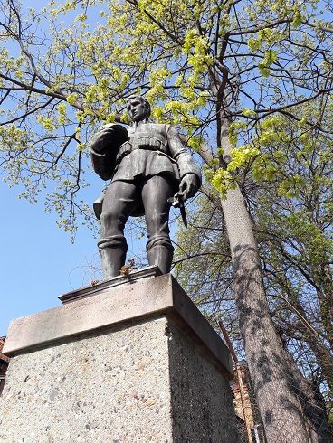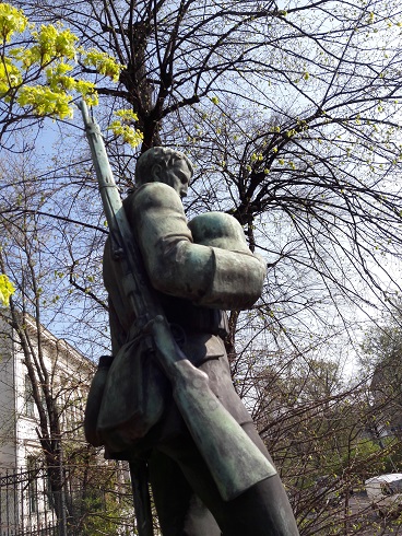 Figura nazywa się, podaje strona internetowa Volksbund Deutsche Kriegsgräberfürsorge e.V., Zygfryda (wagnerowskiego?) bądź zwyczajniej Młodego Wojownika; odsłonięto ją w 1921 r., dłuta duesseldorfskiego profesora nazwiskiem Netzer. Kontrowersja osadza się na tym, że Sigfriedzik uchwycony został w momencie ruchu obejmującego miecz i pochwę doń. Kontrowersja osadza się na tym, czy on ten miecz chowa ze smutkiem i pacyfistycznym przekazem, czy wysuwa go, z zmęczoną determinacją szykując na kolejny bój. Różnica dość ważna, i, świadcząc po śladach czerwonej farby na pomniku, które dostrzegłam w trakcie mojej wizyty, rozpalająca niektóre co serca. W moim osobistym ujęciu Zygfryd miecz chowa, a więc wydźwięk pacyfistyczny — nie wnioskuję tego na podstawie żadnych wypowiedzi czy analiz biografii, a kąta nachylenia wyrzeźbionego nadgarstka, który do wyciągania byłby po prostu kapitalnie nie adekwatny.