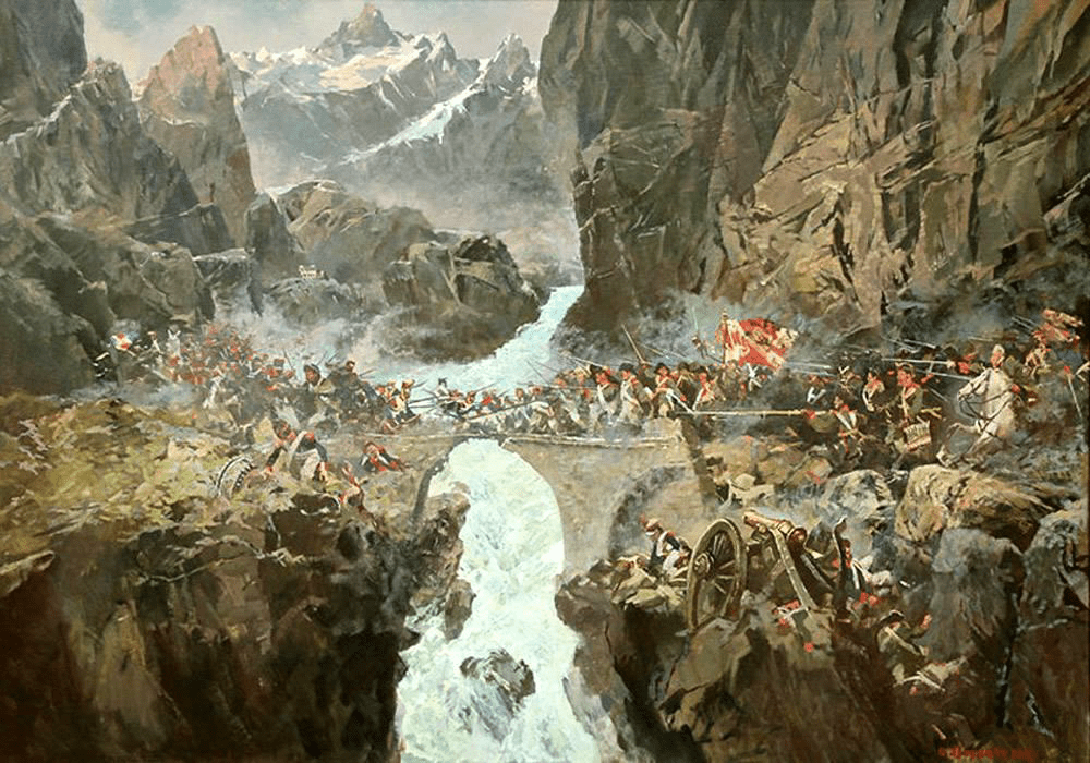 W obszernym hallu urzędował w roli szwajcara, ubrany po wojskowemu i obwieszony medalami, emerytowany feldfebel. W hallu znajdowały się drzwi do mieszkań inspektora i dyrektora, okna tych mieszkań wychodziły na Krakowskie Przedmieście. Między oknami w korytarzu wisiały obrazy przedstawiające sceny z historii Rosji, n.p. Przejście armii Suworowa przez Diabelski Most w Alpach – poniżej obraz na ten temat, ale nie ten który był w opisywanym tu gimnazjum.