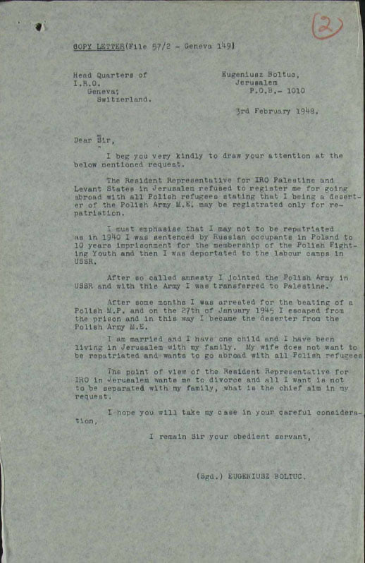 Obóz odwiedza grupa jakichś oficjeli, wśród których znajduje się polski poseł. Eugeniusz, czyli Gienek, sprawia temu posłowi lanie (za co? – proszę mnie również nie pytać ) i trafia do pudła. Ucieka zza kratek, łapią go i znowu idzie siedzieć, tym razem oskarżony o dezercję z Wojska Polskiego (a więc nadal musiał w nim służyć ). Więzienie znajduje się w Nablus, w Palestynie. Stamtąd Eugeniusz śle pismo do I.R.O. w Genewie, Międzynarodowej Organizacji Uchodźców (następczyni UNRRA ), zajmującej się ich ewakuacją i repatriacją. Pełnomocnik organizacji, odpowiedzialny za Jerozolimę, proponuje mu powrót do Polski, gdzie Gienek obawia się represji ze strony komunistycznych władz, prosi więc o objęcie go programem ewakuacji do Europy Zachodniej. Tej prośby I.R.O. (finansująca obydwa programy ) nie może spełnić, ponieważ Eugeniusz jest wojskowym dezerterem. To się Eugeniuszowi wcale nie podoba, w ramach protestu robi więc dwutygodniową głodówkę i nagłaśnia sprawę w prasie, co mu prawdopodobnie pomaga wyjść warunkowo z więzienia. Przesądza jednak jego ostateczna, oficjalna zgoda na repatriację do Polski. Jest jednym z uprzywilejowanych, polskich więźniów, którzy mają dołączyć do rejsu pasażerskim samolotem do kraju, ale kiedy przychodzi czas odlotu, nie ma go na płycie lotniska.